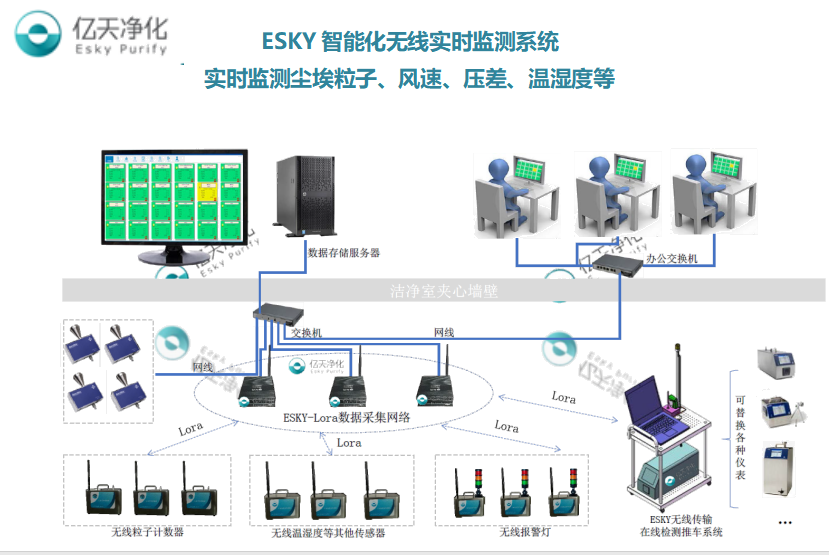 深圳億天凈化提供的ESKY智能化無線實時監測系統以其安裝方便、靈活性強、性價比高等特性,使得更多企業用戶采用無線監測方式,省去網絡布線,降低施工難度,節約施工時間。