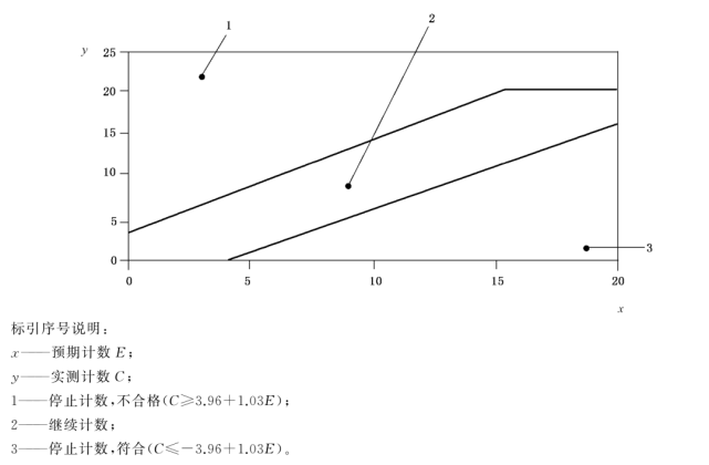 e) 如果累積實測計數(shù)穿過上限,在該點停止采樣,認為空氣不符合規(guī)定的等級限值; f) 如果累積實測計數(shù)穿過下限,在該點停止采樣,認為空氣符合規(guī)定的等級限值;