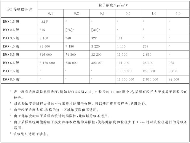 注:潔凈度水平應以ISO 等級濃度來描述,它代表單位容積空氣內最大允許粒子濃度。