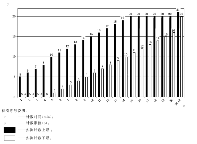 在圖 D.2 中畫出了實測計數(shù)的上下限與計數(shù)獲取時間之間的關系。其所在列表示的是在1 min 的時間間隔內的限值(上限和下限)。